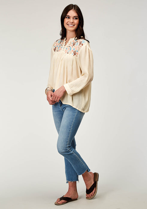 Women's Cream Rayon Crepe Blouse * Long Sleeve * 1/4 Length CF Button Closure * Embroidery Decoration * Garment Washed For Softness