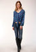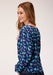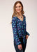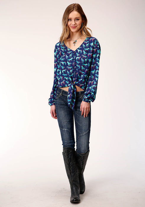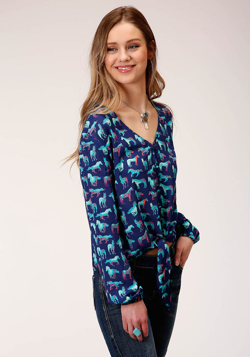 Women's Wild Horse Printed Rayon Long Sleeve Blouse * Open 'V' Neck * Self Fabric Covered Button Front Closure With Tie Accent * Elastic Cuffs * Garment Washed For Softness