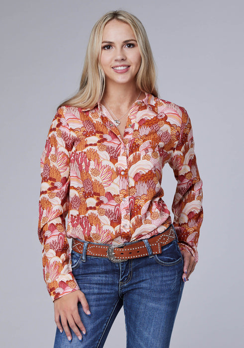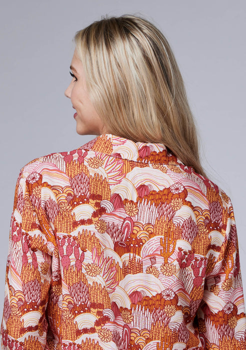 Women's Groovy Cacti Printed Rayon Western Blouse * Long Sleeve * Snap Closure * Garment Washed For Softness