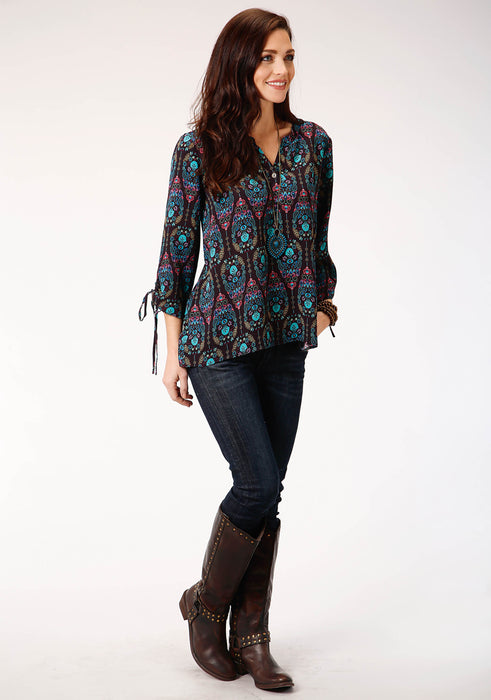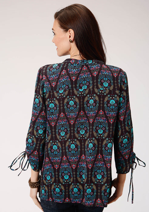 Women's Pretty Peasant Blouse In Soft Poly Moss Crepe * Adjustable ÔøΩ Length Sleeves Are Shirred And Tied At Cuff * Gorgeous Jewel Tone Paisley Print * Split Placket With Button Closure * Banded Collar