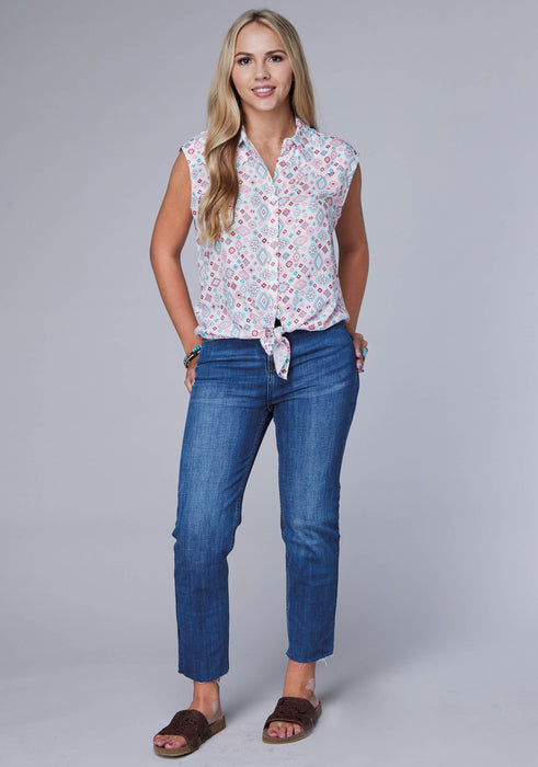Women's Scattered Aztec Printed Rayon Western Blouse * Retro Fit * Sleeveless * Tied At Waist * Button Closure * Garment Washed For Softness