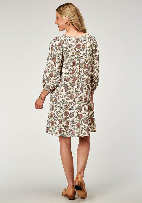 Women's Super-Cute Dress In Rayon Challis "Ditzy Floral" * ¾ Slv W/Elastic Cuffs * Squared F/B Yokes W/Smocking On Frt Yoke * Key Hole Frt W/Self Tie Closure * 2 Tier Ruffle Skirt * Flat Piping On F/B Yoke, Slvs & Between Skirt Tiers
