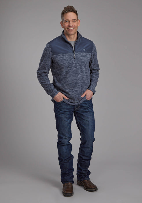 100% Poly Heathered Micro Fleece Pullover * Stand Up Collar * 1/4 Length Zip Front * Straight Front Yokes & 1 Pt Curved Bk Yoke Pieced W/Nylon * Reflective Zipper Pulls * Screen Printed Logo