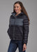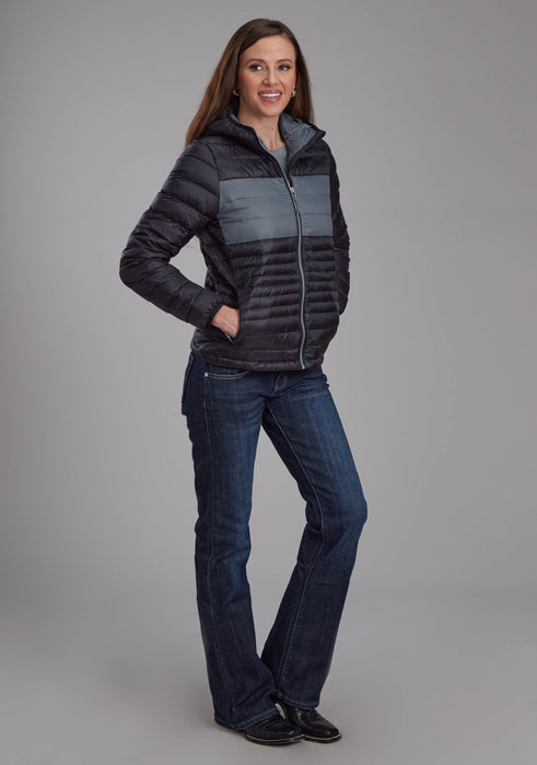 Women's Lt Weight Parachute Nylon Jacket * Down Filled * Zip Front * Attached Hood * Horizontal Quilt Lines W/Pieced Contrasting Nylon * Zippered Front Hand Pockets * Elastic Drawcord At Hem * Screened Logo