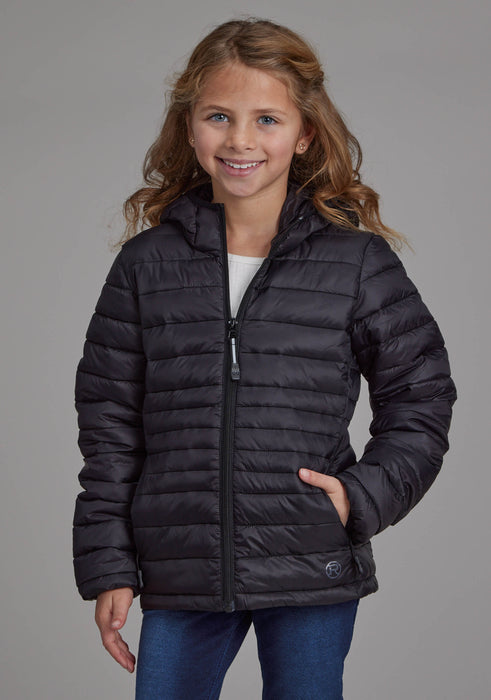 Girl's Lightweight Parachute Nylon Coat * "Down Like" Poly-Filled * Zip Front W/Reflective Pulls * Attached Hood W/Elastic Trim * Front & Back Princess Seams * Horizontal Quilt Lines * Welt Hand Pockets * Screen Printed Logo
