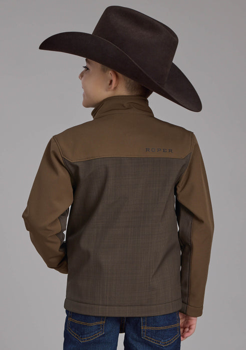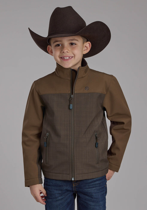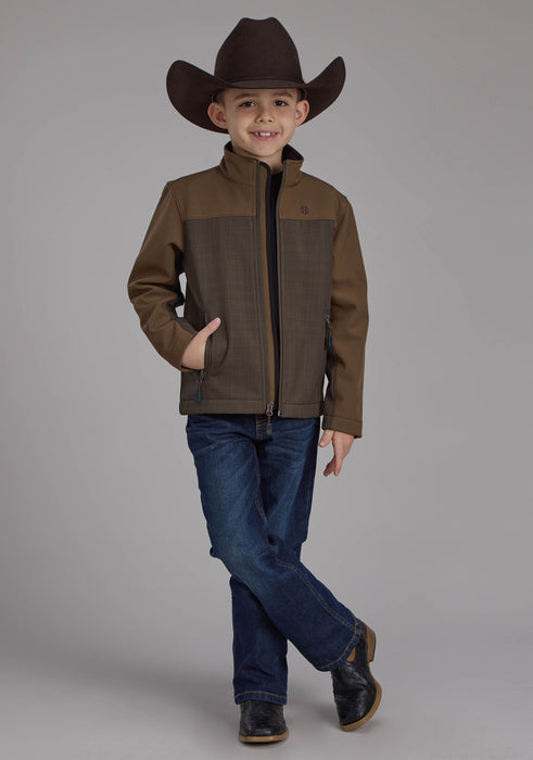 Boy's Technical Outerwear * Pieced Soft Shell Jacket * Lightweight Wind & Water-Resistant Warmth * 2 Zippered Pockets * Brown Cord Zipper Pulls * Black Bonded Fleece Lining * Screen Printed Logos