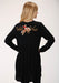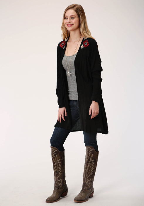 Women's Black Rayon Crepe Mid Length Cardigan * Long Sleeve with Cuff * Embroidery Embellishment On Front & Back Yokes * Garment Washed For Softness