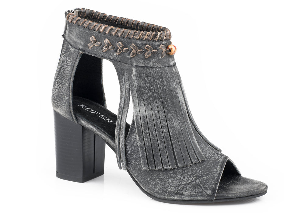 Sanded Black Leather With Fringe * Leather * 3" Heel * Closed Back Open Toe Mule * Whip Stitching On Topline