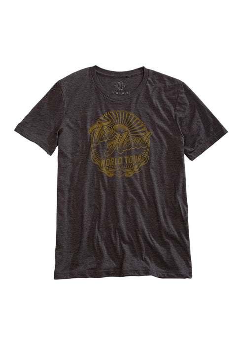 Guys Short Sleeve Heathered Charcoal Grey T-Shirt * Crew Neck W/Rib Knit Collar Band * "Tin Haul World Tour" Screen Print on Front * 52% Cotton/48% Poly Jersey Knit