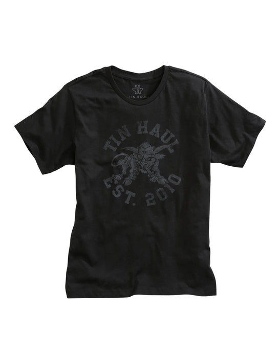 Short Sleeve Black Cotton T-Shirt * Crew Neck With Rib Collar Band * Tin Haul Angry Bull Screen Print On Front