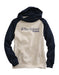 Gal's Oatmeal Fleece Hoodie W/Navy Sleeves * Hood W/Asymmetrical Button Closure * Raglan Sleeve * Front Kangaroo Pocket * Rib Knit Cuffs & Waistband * Dark Blue & Red "Tin Haul Est. 10" Screen Print On Front * 60% Cotton 40% Polyester