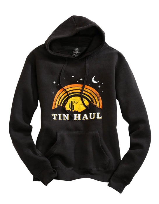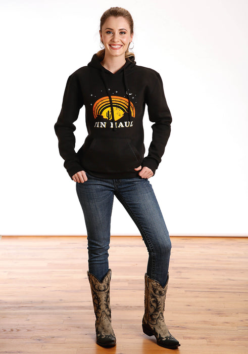Gals Black Fleece Hoodie * Jersey Lined Hood With Drawstring Cord * Front Kangaroo Pocket * Rib Knit Waistband And Cuffs With Thumbholes * "Tin Haul" Under The Night Sky Screen Print On Front