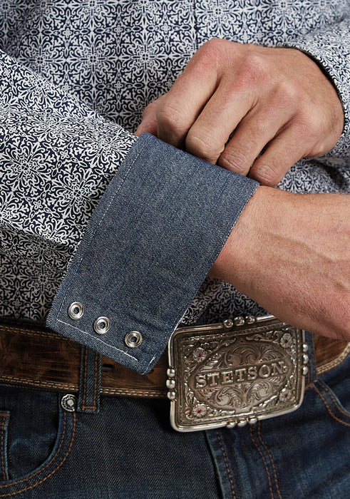Allover Print On Cotton Poplin * 1 Pt Ultra Deep Curved Back Yoke * Stetson "S" Emb * "Stetson" Emb On Rt Sleeve Placket * Denim Inside Trim * 3 Snap Cuff * Snap Front Featuring Logo Pearl Snaps