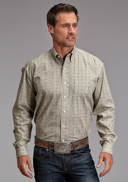 Allover Print On Cotton Poplin * Straight Bk Yoke W/Pleat * Stetson "S" Emb * "Stetson" Emb On Right Slv Placket * Solid Poplin Inside Trim * 2 Btn Adj Mitered Edge Cuff * Classic Btn Front Featuring Stacked Logo Btns