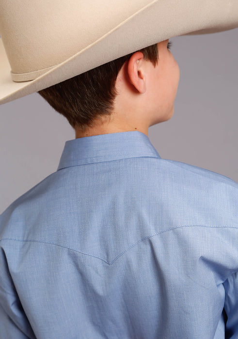 Light Blue Long Sleeve Woven Shirt * 1 Point Curved Front And Back Yokes * Two 1 Point Pockets With Curved Flaps And Snap Closure * Stetson "S" Embroidery * 1 Snap Cuffs * Classic Snap Front Featuring Matte White Logo Snaps