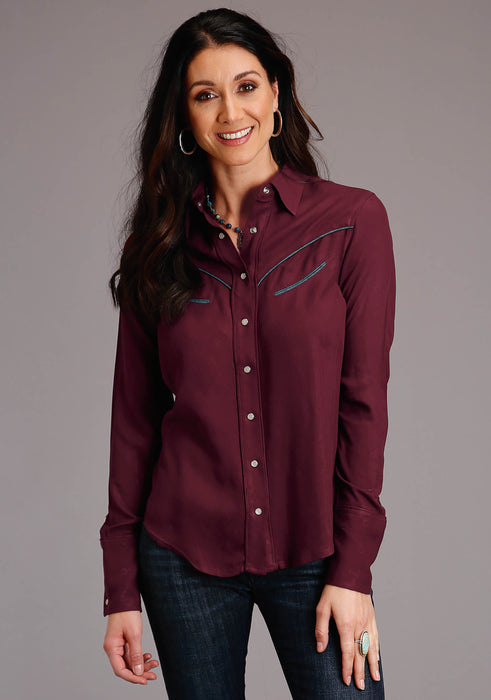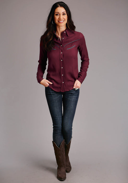 Women's Deep Wine Rayon Twill Long Sleeve Snap Front Western Shirt * Bias Cut Front And Back Yokes, Deep Cuffs And CF Placket * Deep V Front Yoke, Single Point Back Yoke * 3 Snap Deep Cuff * Black Piping At Yokes, Placket, And Above Cuffs