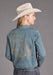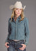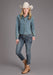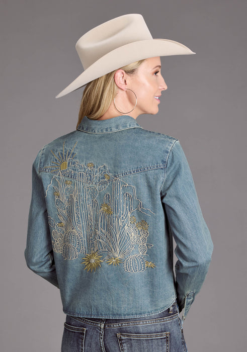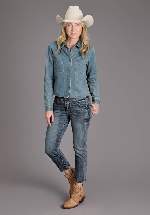Women's Light Wash Denim Long Sleeve Cropped Blouse * Snap Front With Fold Down Collar * Single Point Front Patch Pockets With Pointed Detail Stitch * Single Point Back Yoke * Embroidered