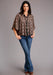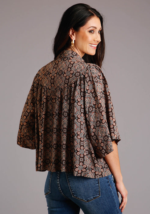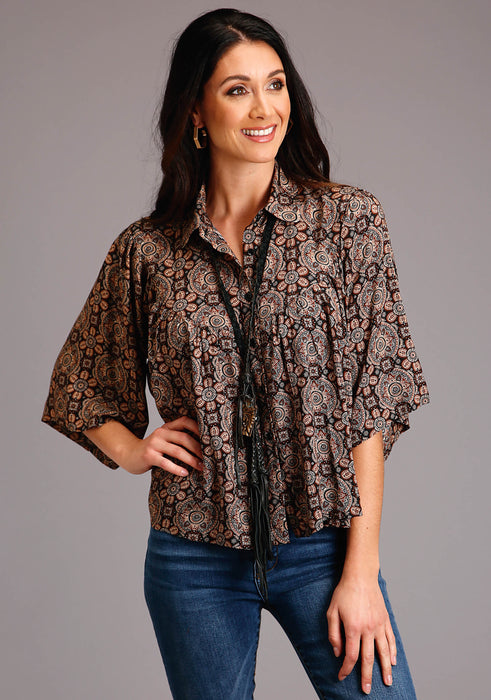 Women's "Prairie Paisley" Print Rayon Loose Fit Short Sleeve Blouse * Loose Ruffled Sleeves And Lower Bodice * Rounded Bib Style Yokes * Pan Collar With Full Front Button Down Closure