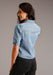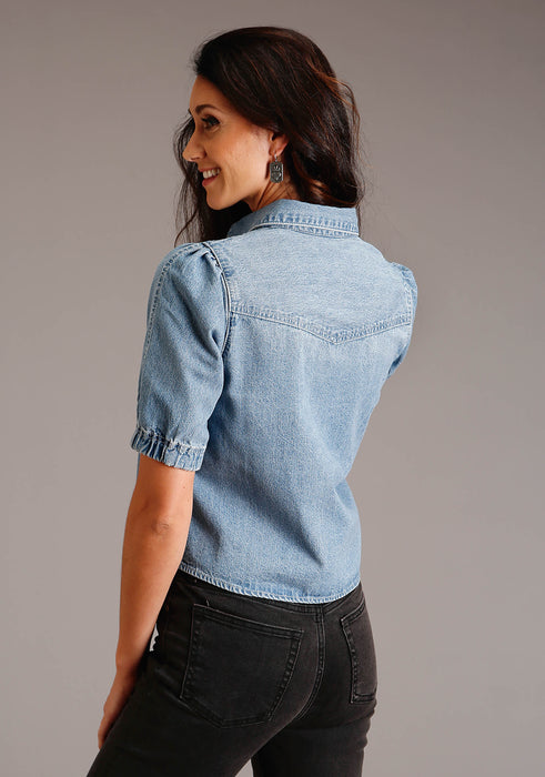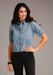 Women's Light Blue Denim Short Sleeve Blouse * Snap Front W/Fold Down Collar * Single Point Front Patch Pockets W/Pointed Detail Stitch * Single Point Back Yokes * Short Sleeves W/Elastic Cuffs & Sleeves Gathers Into Shoulders * Embroidery