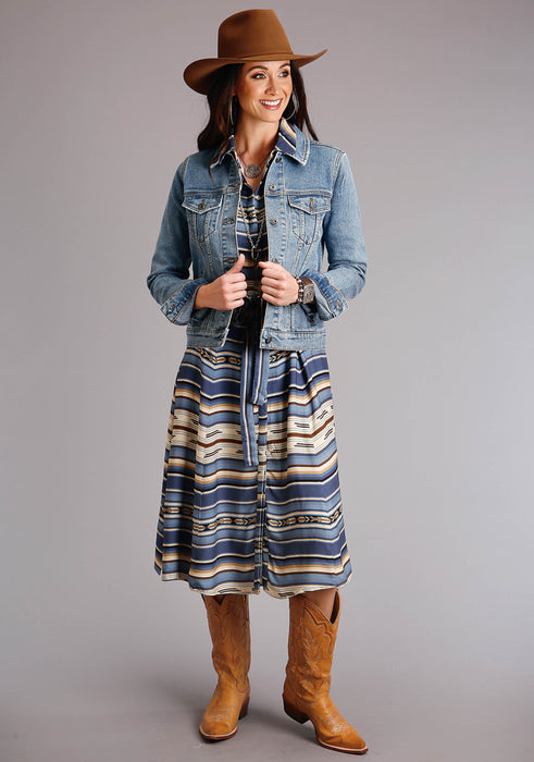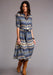 Women's "Indigo Serape" Prt Rayon Twill Mid Length Dress * Fold Dn Collar W/Full Length Hidden Btn Placket Closure * 3/4 length Slvs W/Gathers & Btn Cuffs * Fitted Waistline W/Gathers & Self Fabric Tie * Partially Lined Skirt W/Side Slits