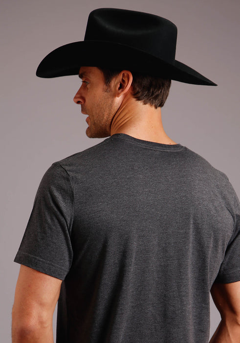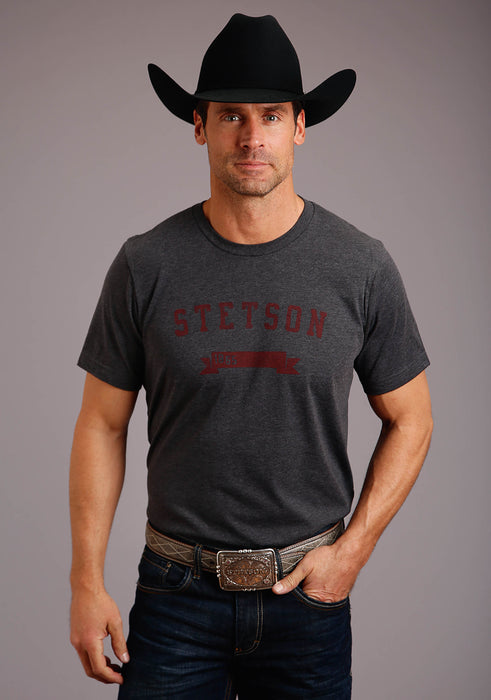 Men's Grey Short Sleeve Jersey T-Shirt * Crew Neck W/Rib Knit Collar Band * Garment Washed For A Super Soft Hand * Cover Stitched Hem * Dark Red "Stetson 1865" Screen Print On Front * 52% Cotton 48% Polyester
