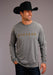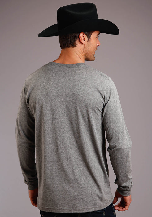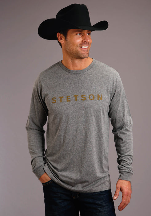 Men's Grey Long Sleeve Tri-Blend Jersey T-Shirt * Crew Neck W/Rib Knit Collar Band * Rib Knit Cuffs * Garment Washed For A Super Soft Hand * Cover Stitched Hem * Dark Gold "Stetson" Scrn Prt On Front * 50% Polyester 25% Cotton 25% Rayon