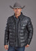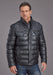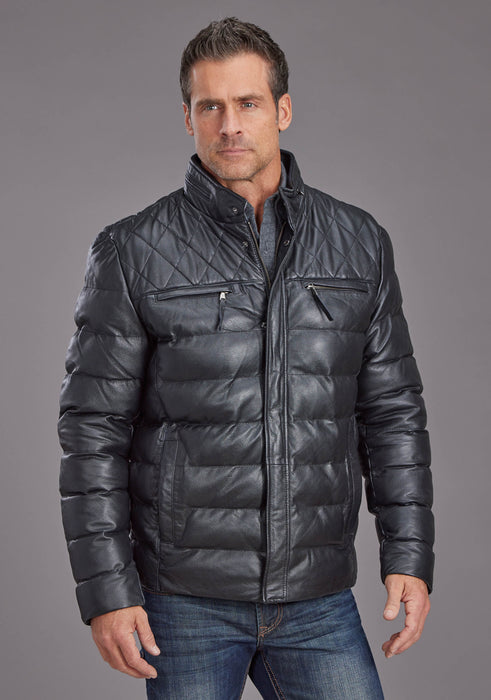Men's Black Leather Quilted Jacket * Poly Filled * Stand Collar With Zip Out Hidden Hood * Vertical Welt Hand Pockets * Horizontal Chest Pockets With Zip Closures * Full Hidden Snap Placket Over Front Zip Closure