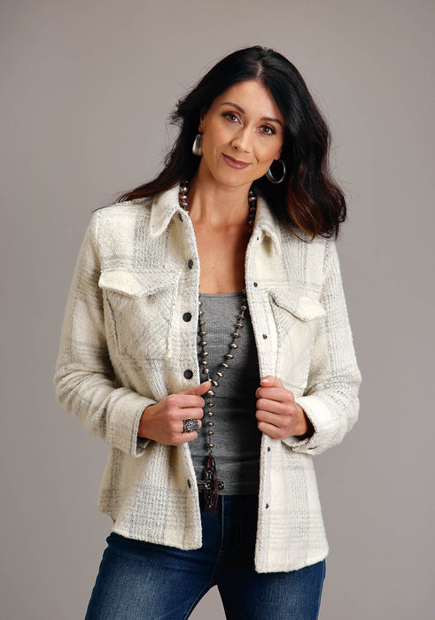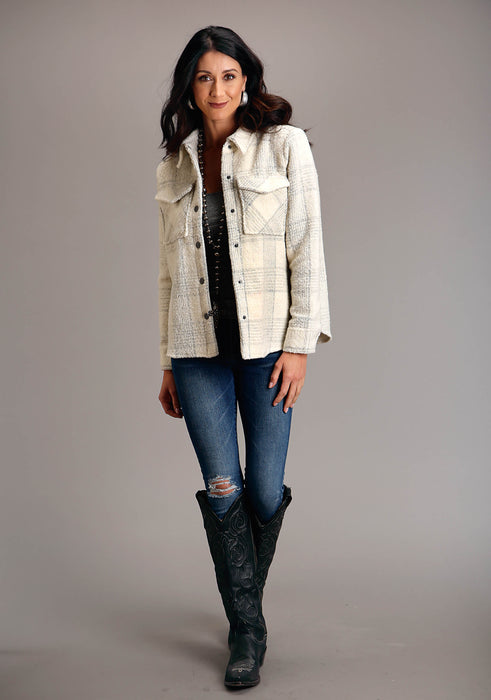 Women's Wool Blend Cream And Black Window Pane Plaid Shirt Jacket * Fold Down Collar And Snap Front Placket * Oversized Patch Front Pockets With Single Point Flap Closure * Long Sleeves With Back Seams Into 2 Snap Cuff