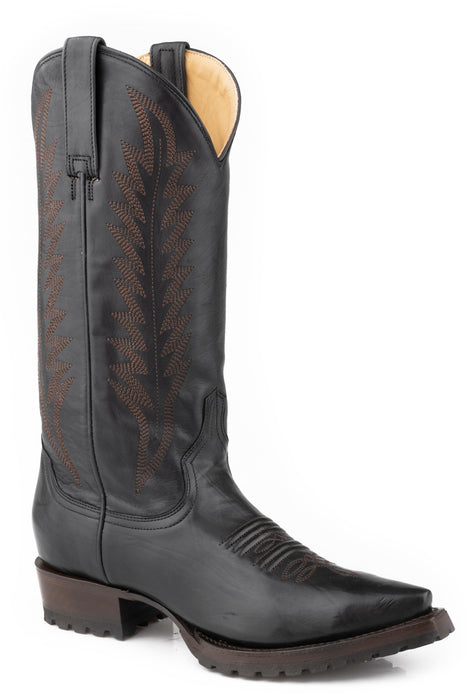 Black Calf Vamp And 13" Shaft * Unique Embroidery On Shaft * Snip Toe * Single Welt * lug Sole * Stacked Heel * Lemonwood Peg and Brass Nail Construction * All Leather Lining * Cushioned Leather Insole