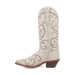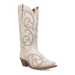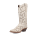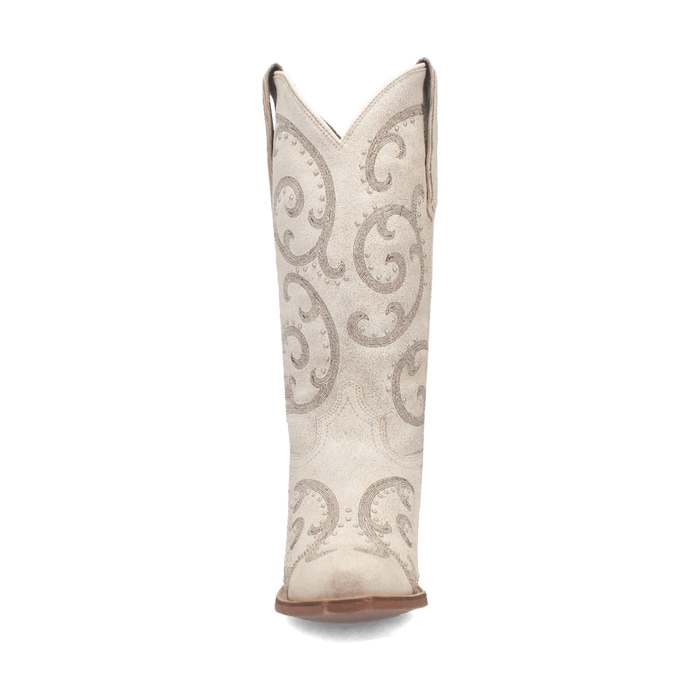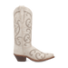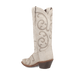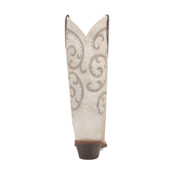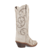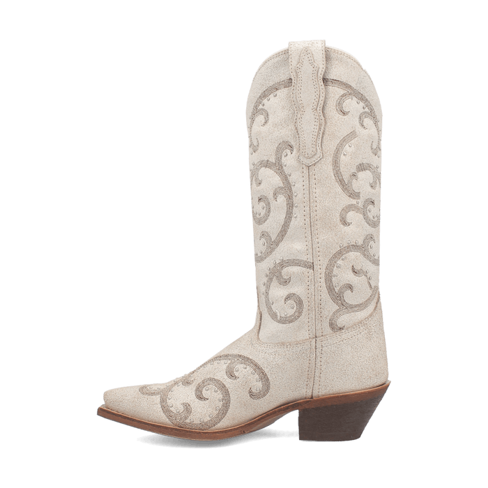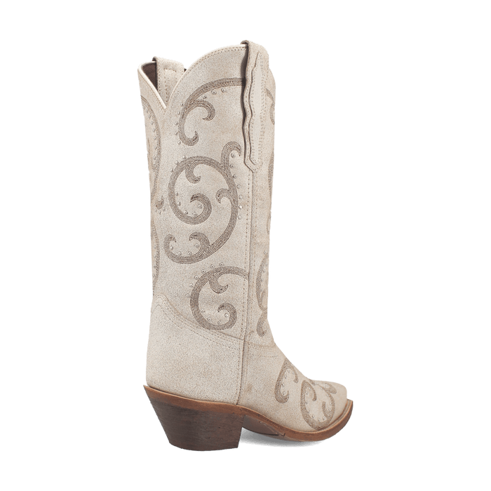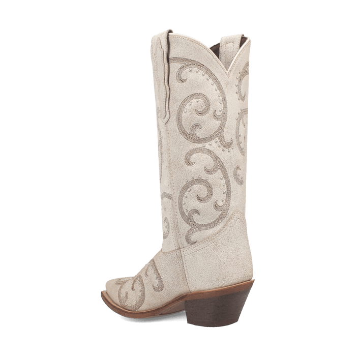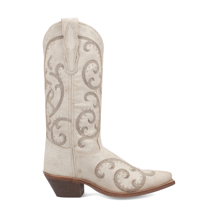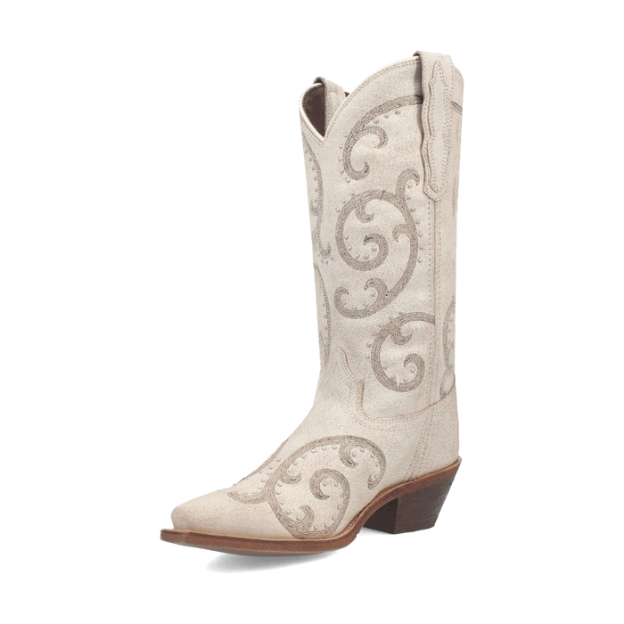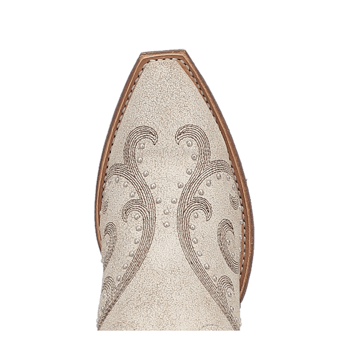 Twirl and dance all night long in the Haisley leather boot in off-white. Metallic studs are artfully integrated along the swirly design, catching the light and accentuating the boot's dynamic patterns. With a cushioned comfort insole, a stylish snip toe, and a medium cowboy heel, these boots are not just stylish—they're made for comfortable, unforgettable nights on the dance floor.