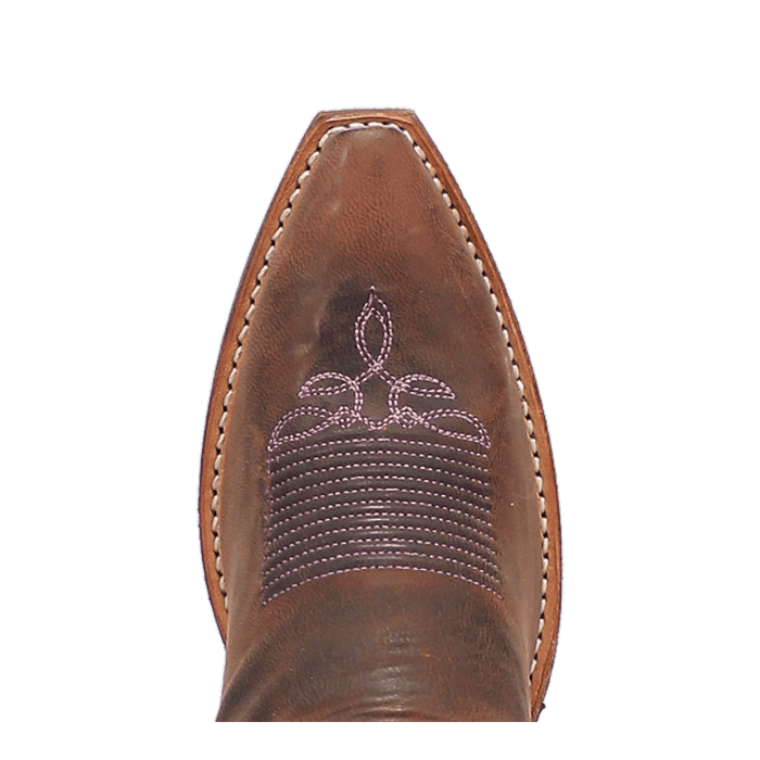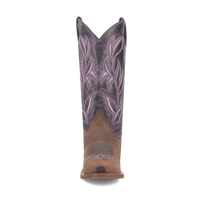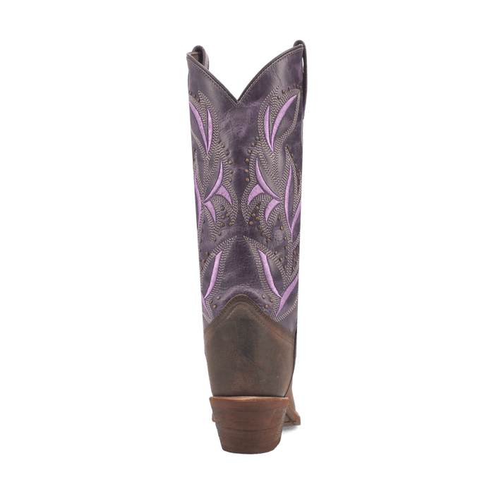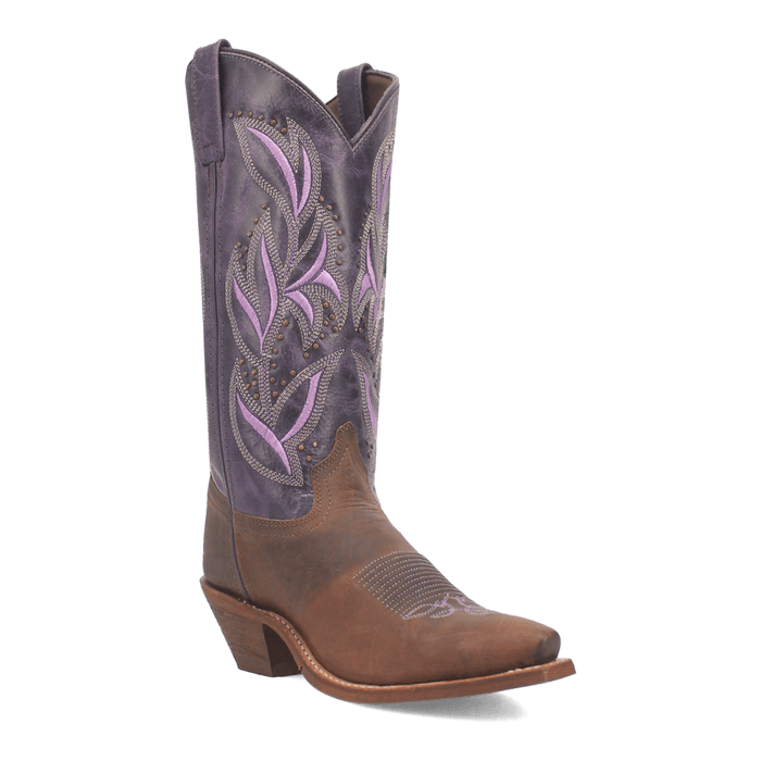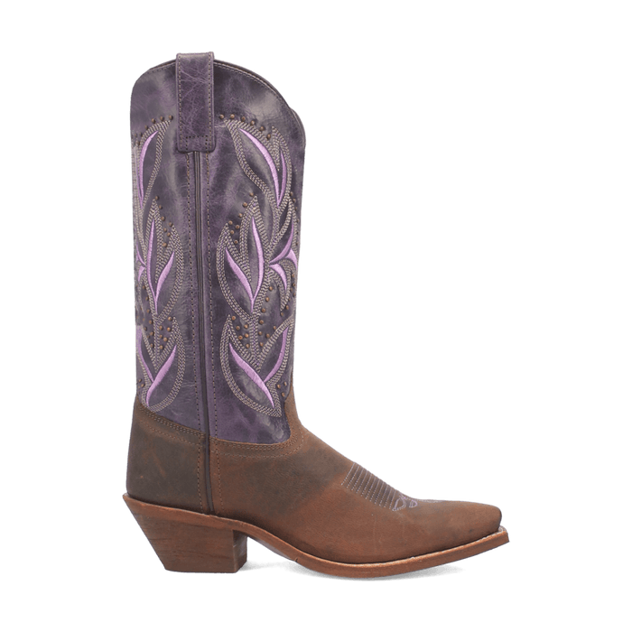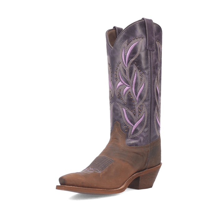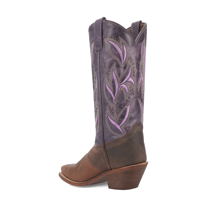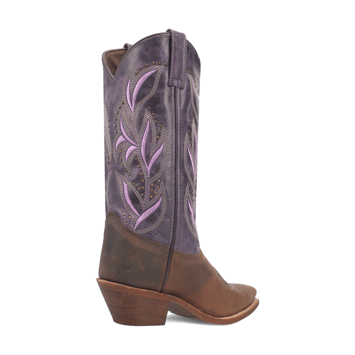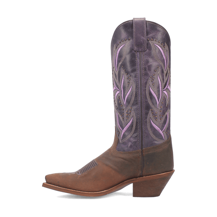 Embrace the Western spirit in the Larissa boot. Uniquely designed with a vibrant purple shaft, intricate stitching, and studs to add a touch of flair. Featuring a classic snip toe, cowboy heel, and cushioned comfort insole.