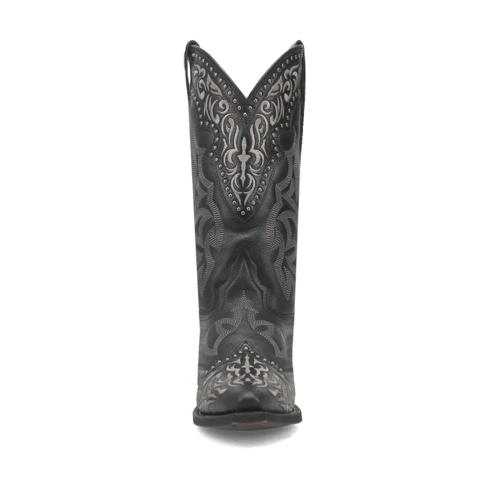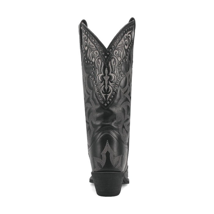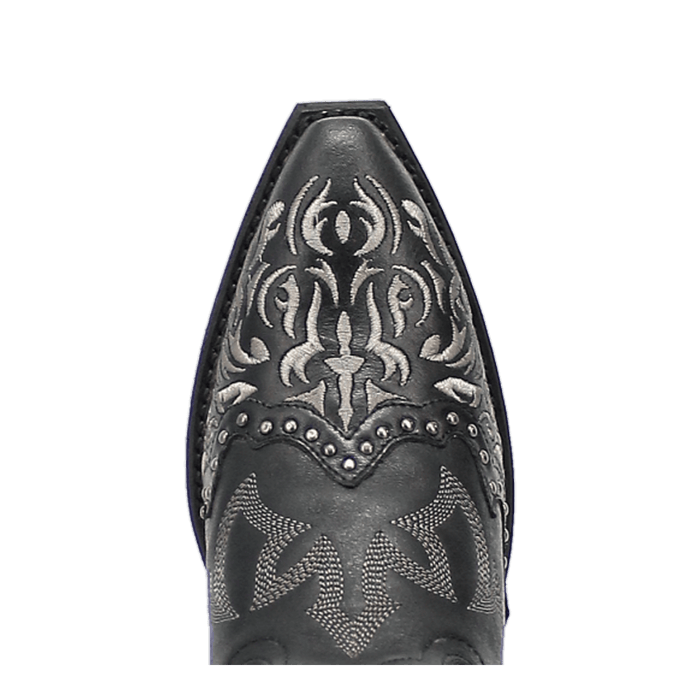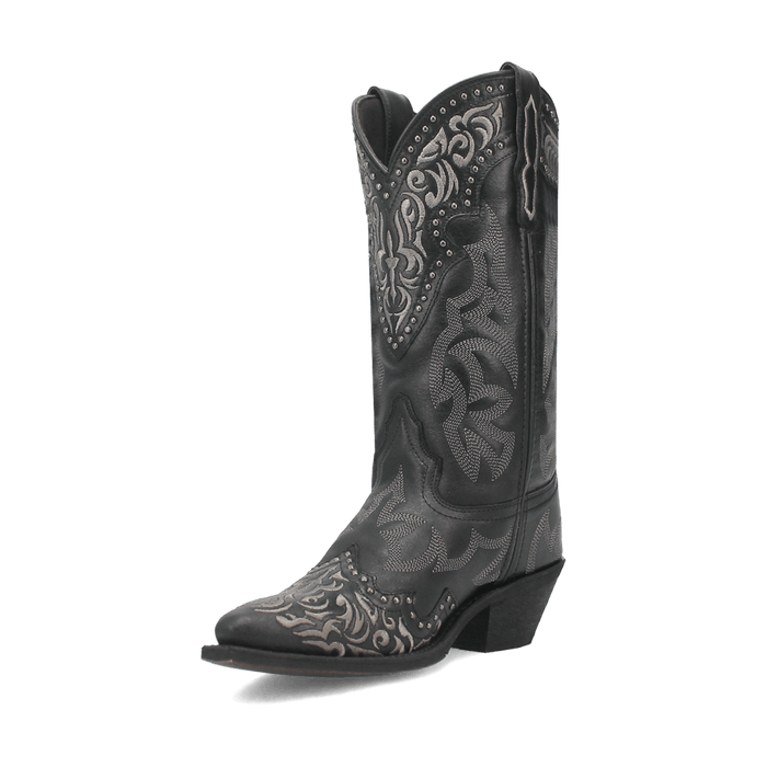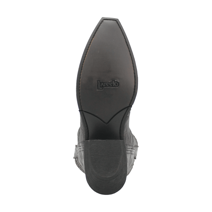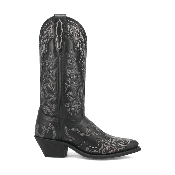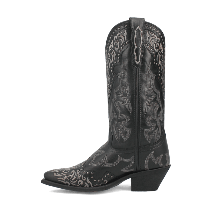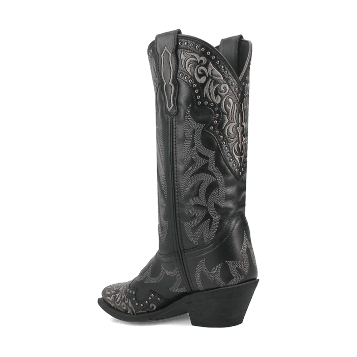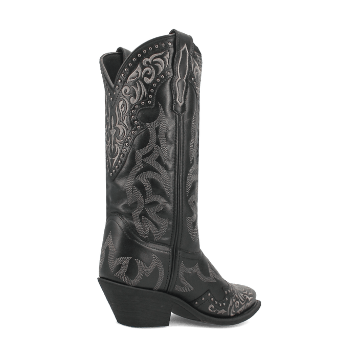 Cowgirl chic meets edgy in the Regan leather boot from Laredo. Adorned with metallic studs and intricate stitching creating an eye-catching pattern. Experience all-day comfort with a cushioned insole, a stylish snip toe, a durable rubber outsole, and a classic cowboy heel.