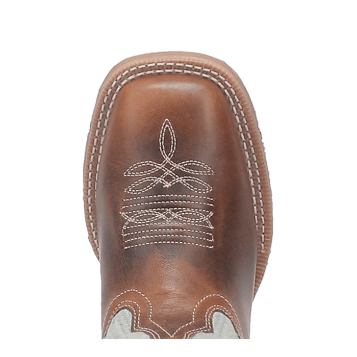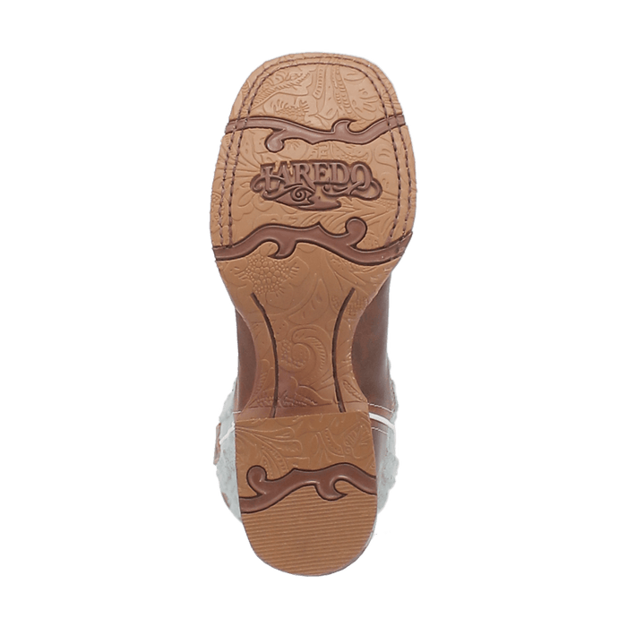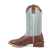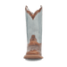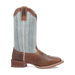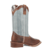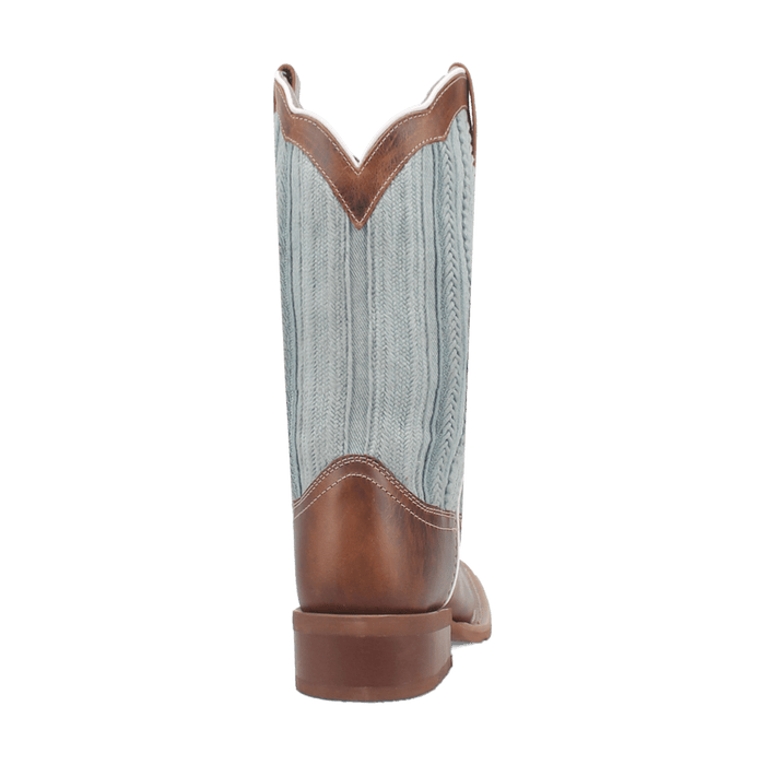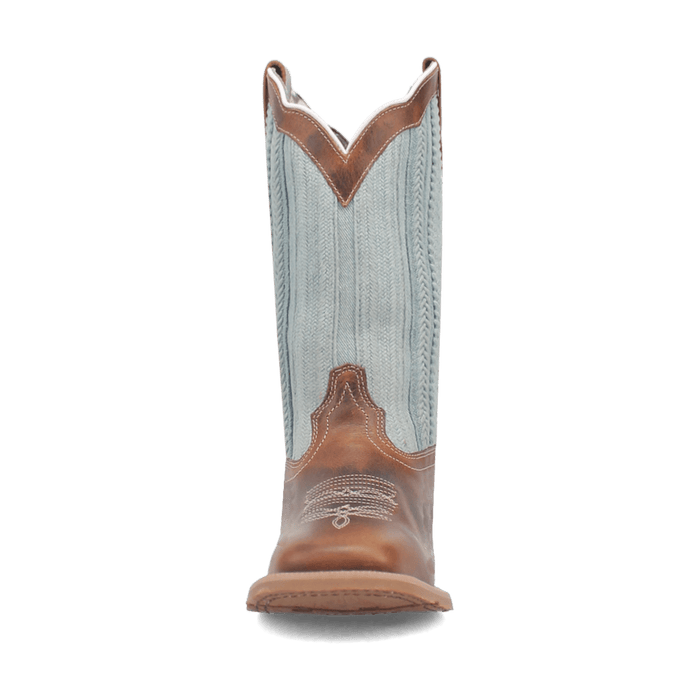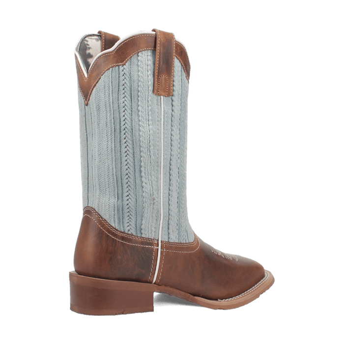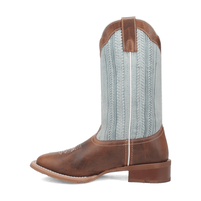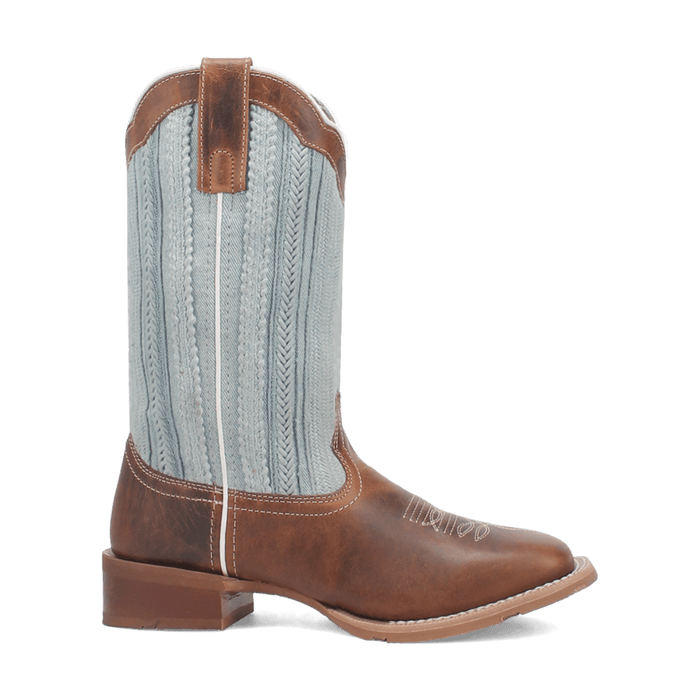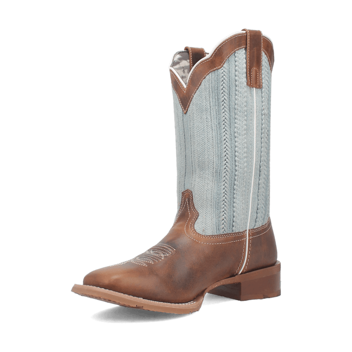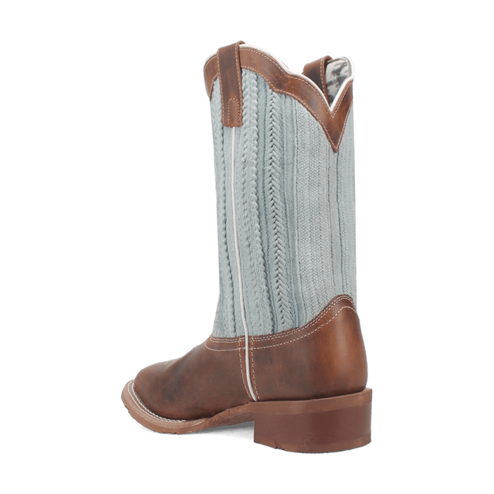 Glow in the Blue Moon boot from Laredo. The fusion of denim and braided embroidery on the shaft presents a distinctive design. Designed for comfort, it features removable orthotic, broad square toe, rubber outsole, and stockman heel.