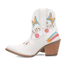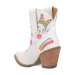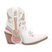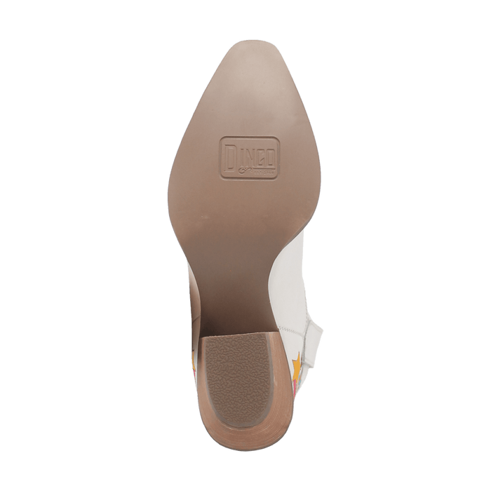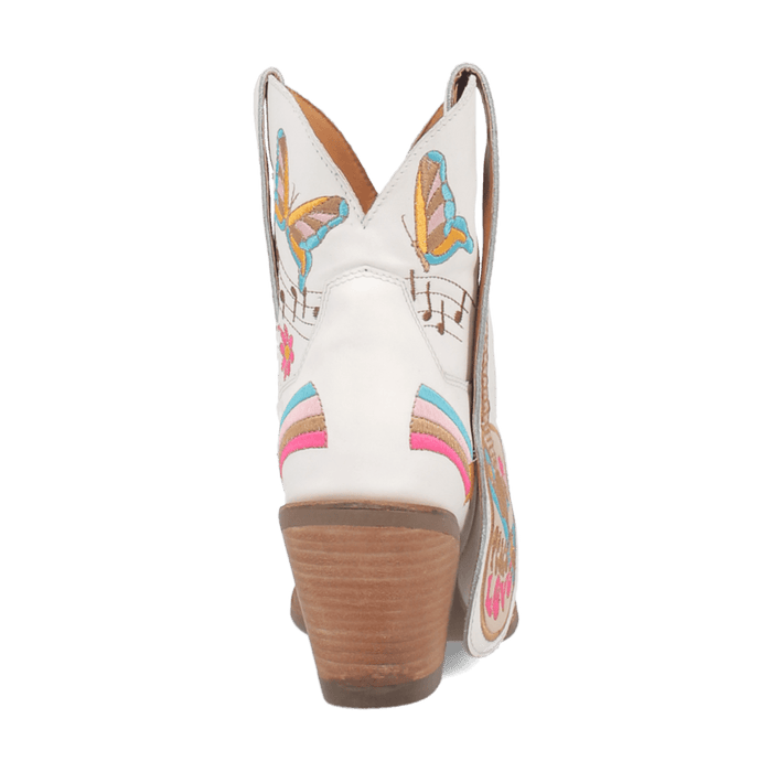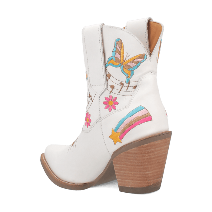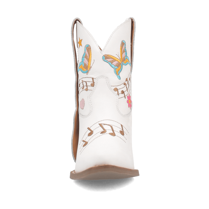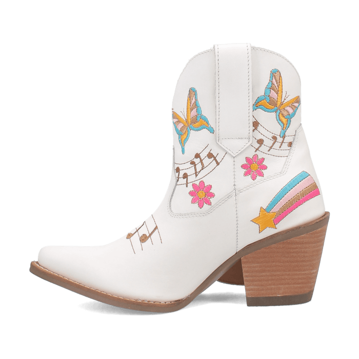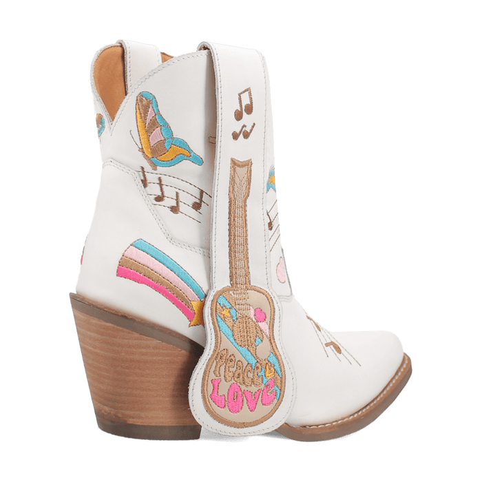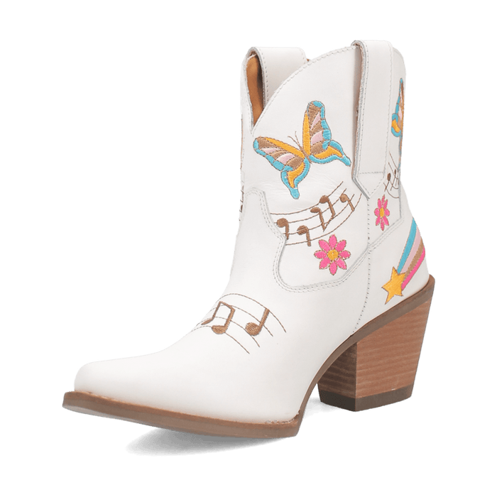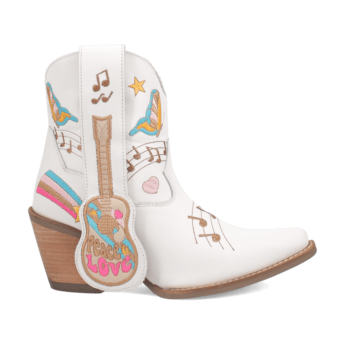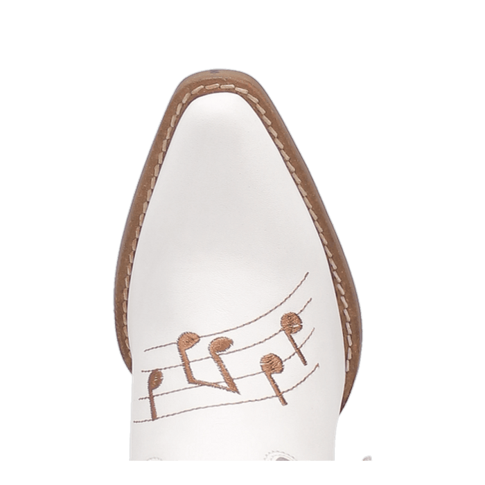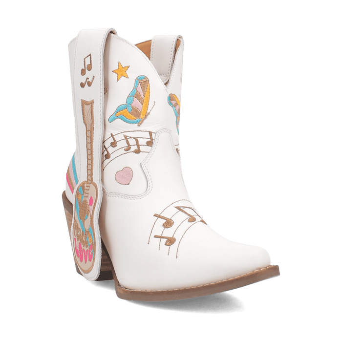 Embrace Nashville's rich musical heritage with the Melody leather bootie. Featuring a guitar-shaped pull strap, musical notes and vibrant embroidery throughout, creating a harmonious tribute to the city's lively music scene. Whether you're rocking them at a country concert or casually strolling down Broadway, the cushioned comfort insole, snip toe, and 3-inch tall fashion heel will have you walking in style.