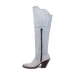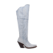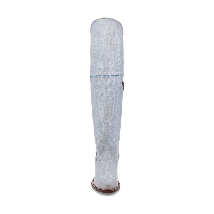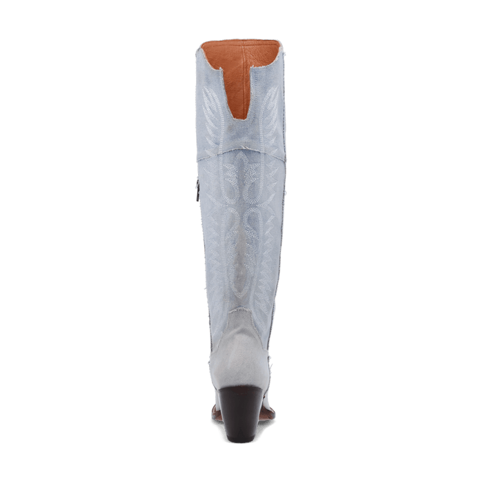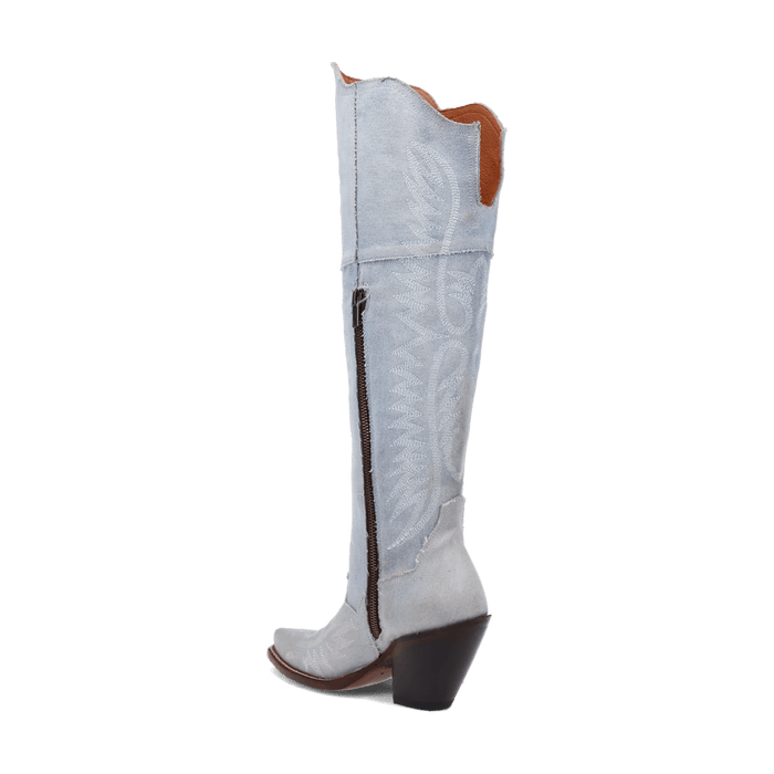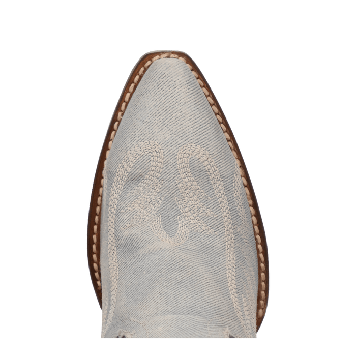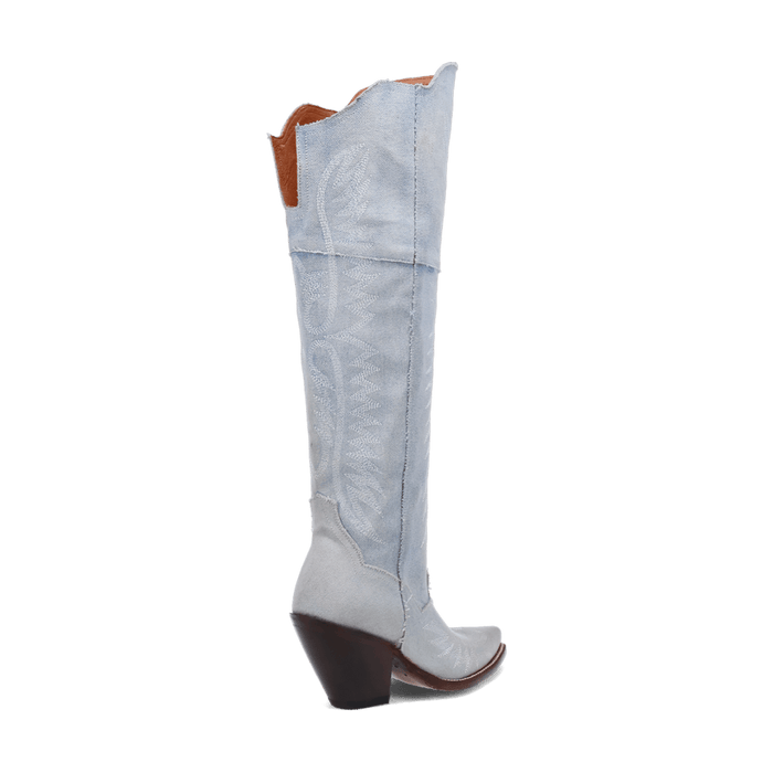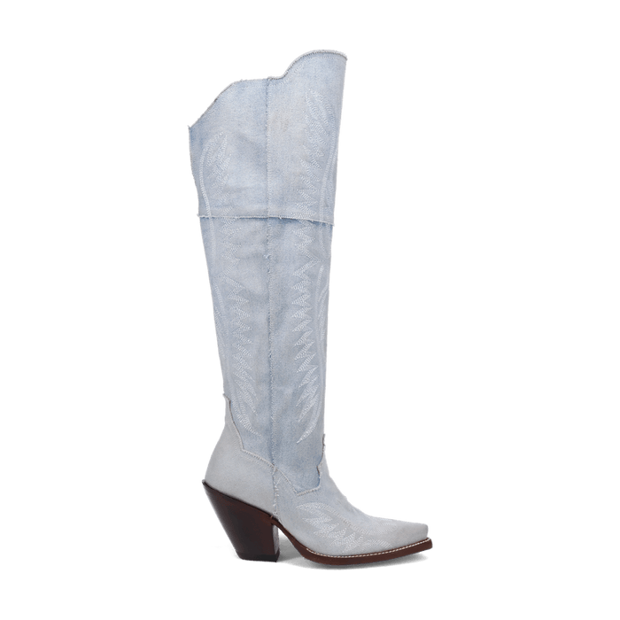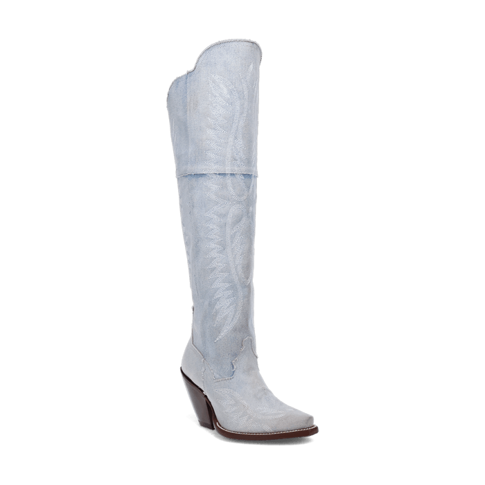 The denim boots of your dreams. Introducing Blue Jean Dream Denim to Dan Post's 20” boot collection. Featuring a high fashion heel, snip toe, leather outsole and zipper for an easy slip on and off. The light blue denim and angelic stitching will have you feeling like you are on cloud nine.