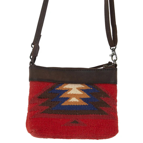 Full-grain matte chocolate leather with woven serape in Aztec and ombré patterns
