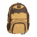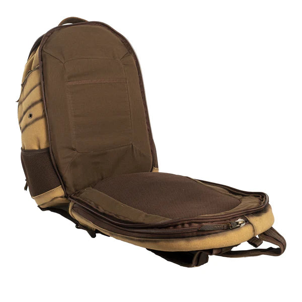 Adjustable padded canvas backpack straps and top leather carry handle embossed with "STS Ranchgear"